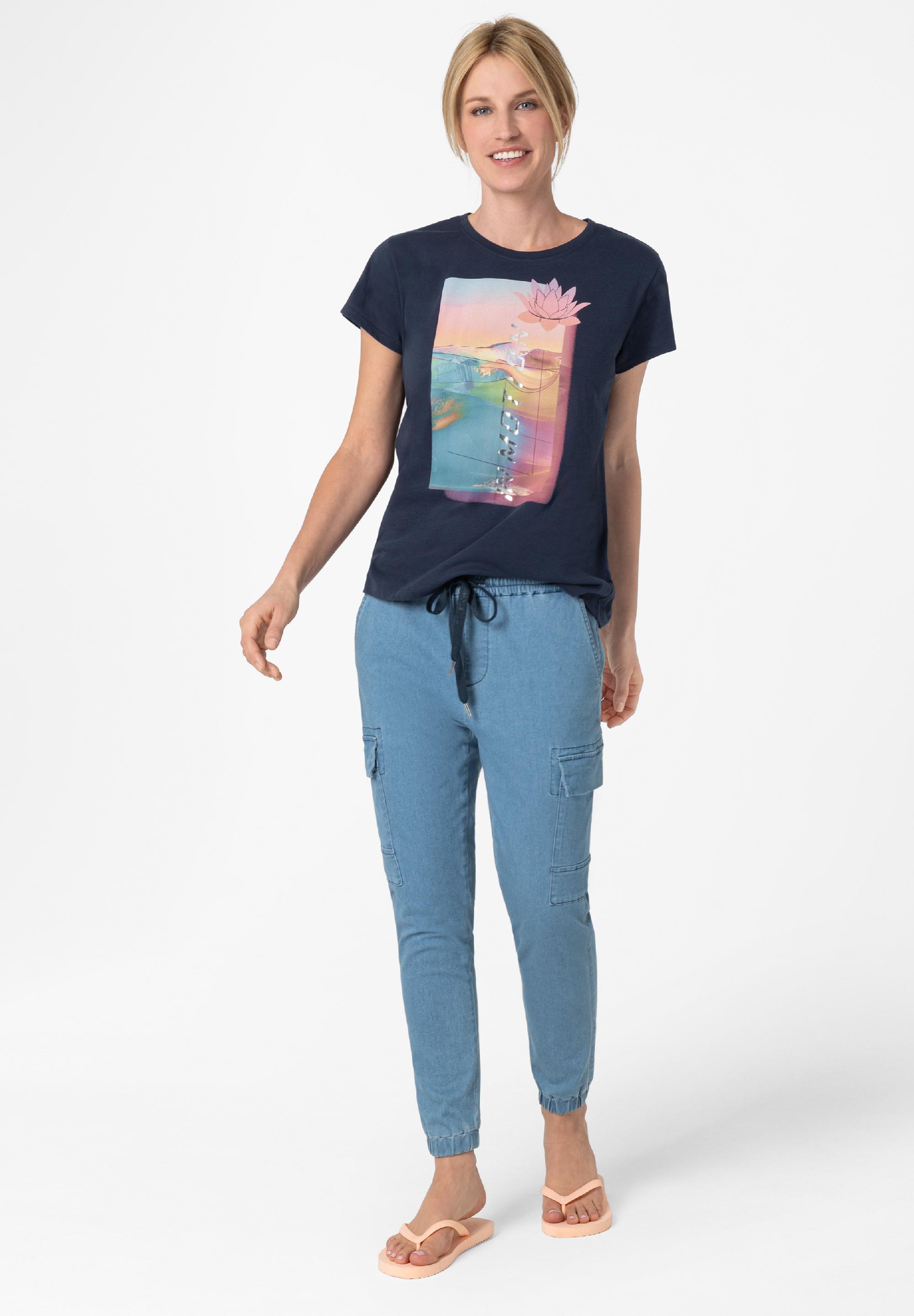 T-Shirts lassen sich zu jedem Outfit kombinieren, deshalb lieben wir sie so. Ob lässig zum Jeans-Sneaker-Look oder edgy im Stilbruch zu Blazer und Anzughose. Sie sind extrem wandelbar, setzen Statements und sind dabei immer stilvoll. Dieses Modell besticht durch den zauberhaften Frontprint in hellen Rosa- und Blautönen und dem Kontrast in Metallic-Silber. Schnitt und Single Jersey sind klassisch, regular und aus feiner, leichter Baumwolle. Mit Rundhalsausschnitt und kurzen Ärmeln.